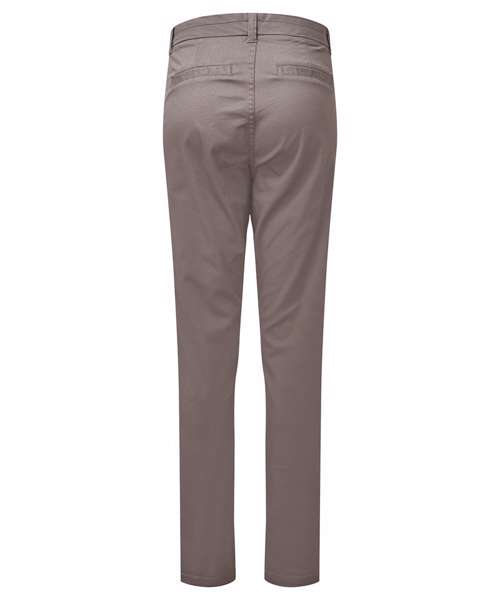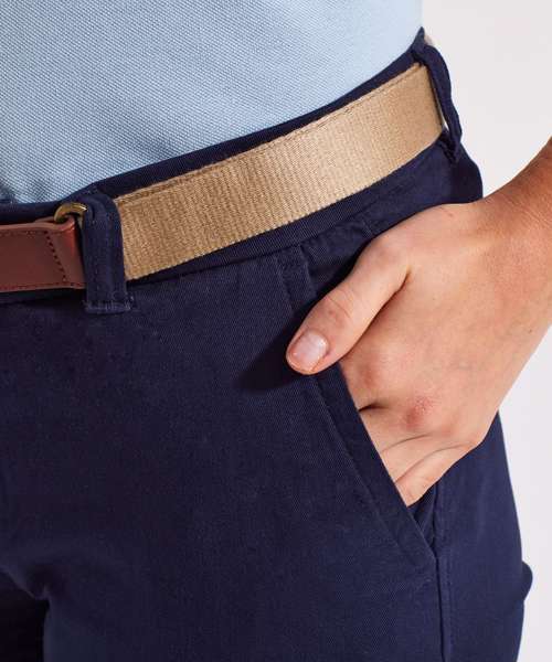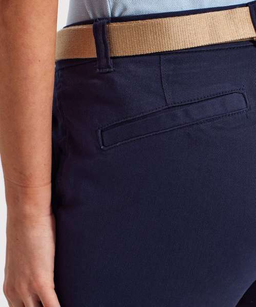 Women's classic fit chinos in a soft fabric finish. Zip fly with button fastening at waist. Belt loops. Two swing pockets to the side and two non-functional back jetted pockets for styling. Product contains no branded neck label. Removable Kimble or looped garment tags. Inner seam label holds important product information on one label with a second label containing brand information which can be cut-away. Please note old stock may contain a fixed branded label.