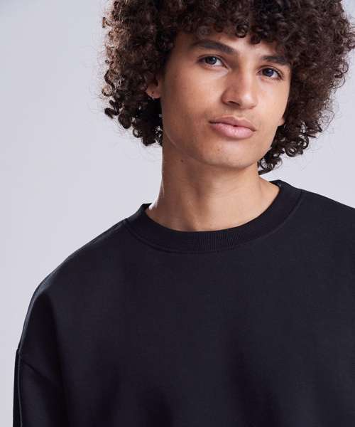 Oversized fit. Boxy shape. Heavyweight. Ribbed cuff, hem and collar. 100% cotton face fabric. Tear-away label.