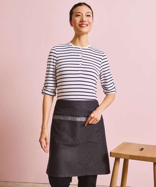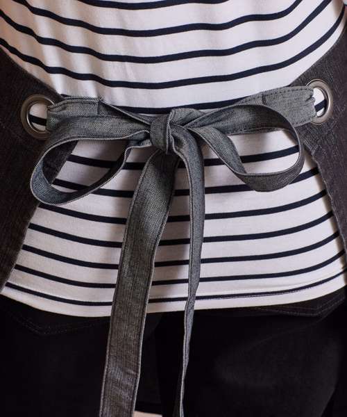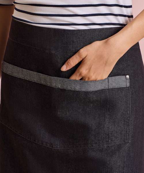 A quirky addition to the denim range, this mid-length apron gives an 'industrial-chic' feel to service with large metal eyelets securing the waist ties in place. The shade on the underside forms the contrast trim detail on the pocket and ties for a great reversible effect.