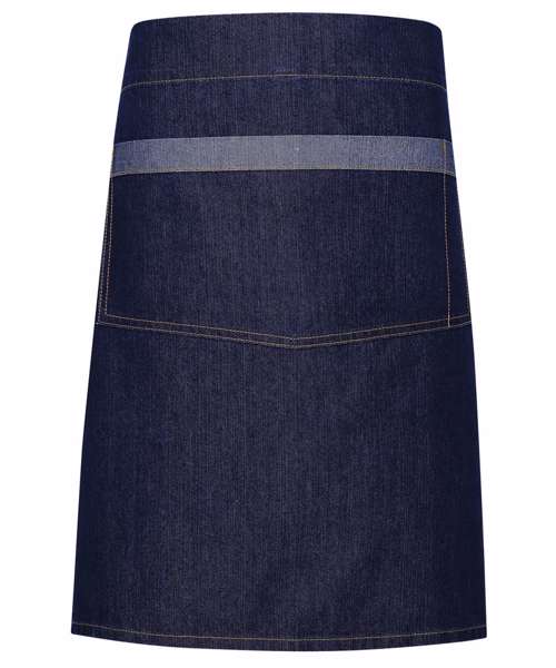 Mid-length denim waist apron with two large metal eyelets that secure the waist ties. Large centre pocket measuring 36cm wide with combined pen pocket. Contrast trim on pocket and ties gives a two-tone denim effect. 50cm long by 70cm wide.