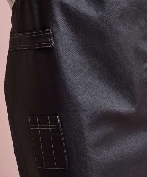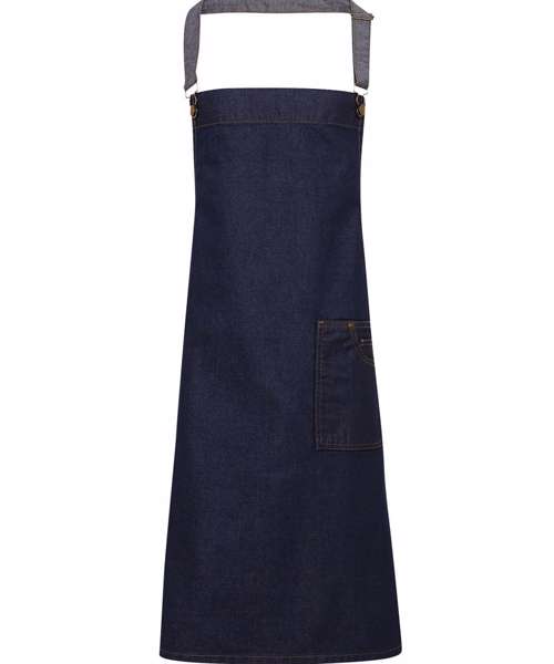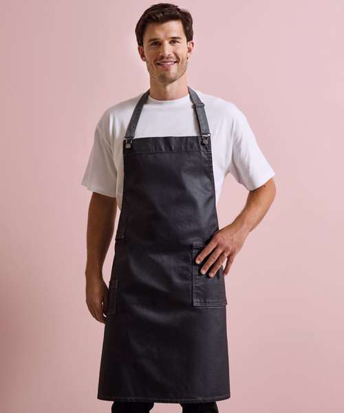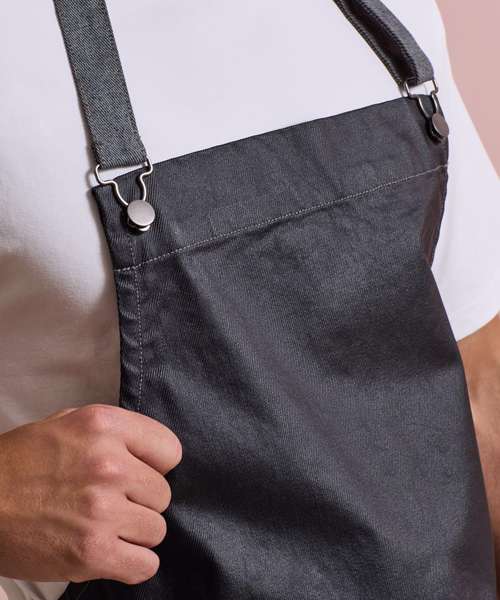 A bib apron boasting style accents from your favourite pair of jeans! An oversized patch pocket roomy enough for a tablet device with classic stitched pocket detail for styling. The waxed effect gives a tough, durable appearance with an industrial-chic feel that reflects the interior decor of many modern day restaurants.