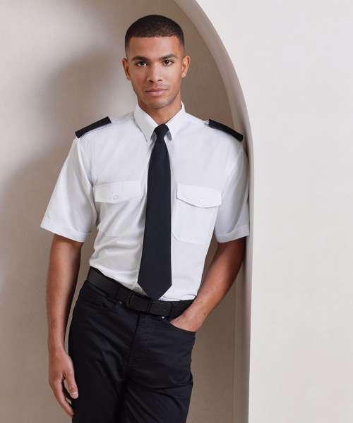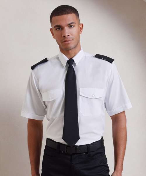 A men's short sleeved pilot/security shirt with a stiffened collar and tabs for epaulettes on shoulders for those who need a more authoritative approach to their workwear.