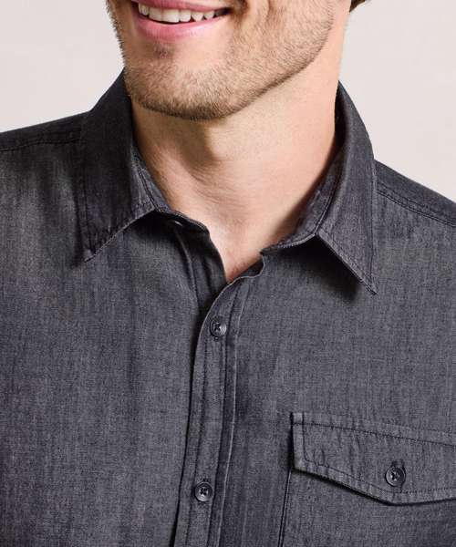 Long sleeve denim shirt with contrast stitch detail with left breast pocket. Buttoned cuff and sleeve guard. Curved hem. Back yoke.