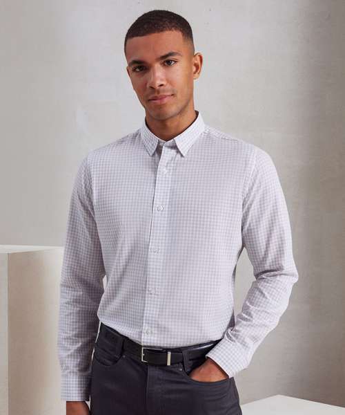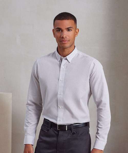 Yarn dyed fabric creating a gingham pattern. Long sleeve with single button cuff and sleeve guard. Narrow soft collar with button-down options on the underside. Semi fitted. Easycare fabric.