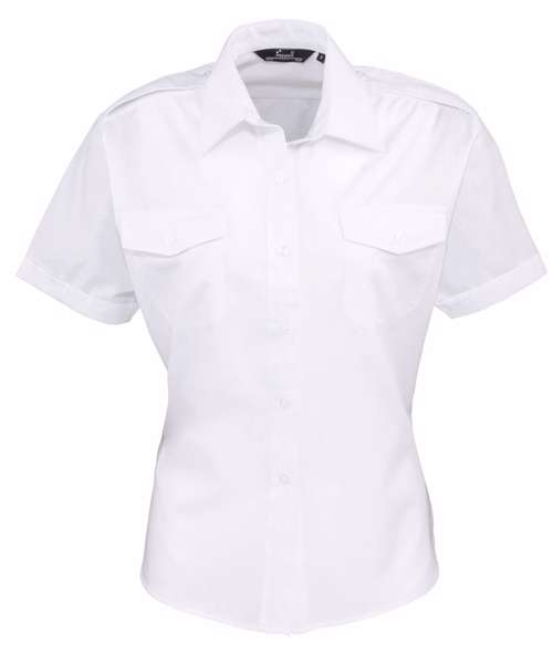 Women's short sleeve easycare pilot shirt. Stiffened collar. 2 chest pockets with button flaps. Combined pen pocket on left breast pocket. Short sleeves. Epaulettes on shoulders.