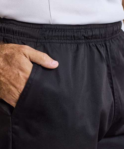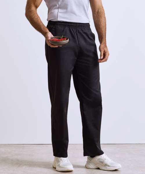 Unisex pull on chef’s trouser. Available in Black or White check or plain Black. Elasticated waist for easy pull on trouser. Unisex sizing. 30.5" inside leg. Side swing pockets. Drawcord.
