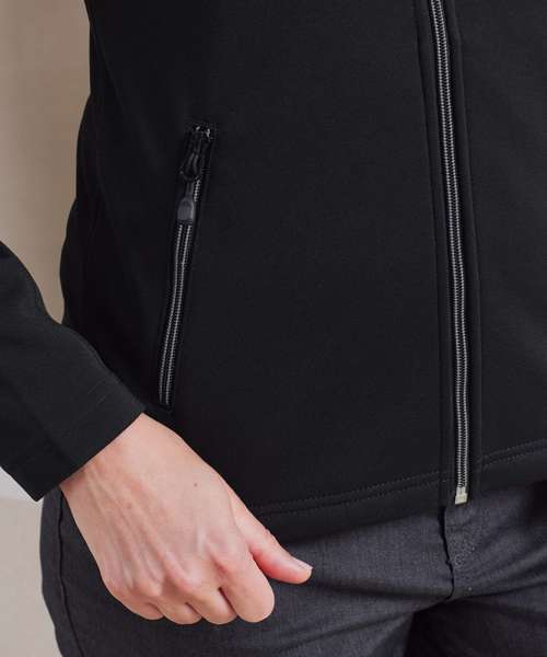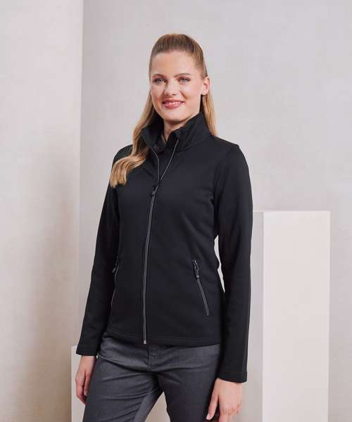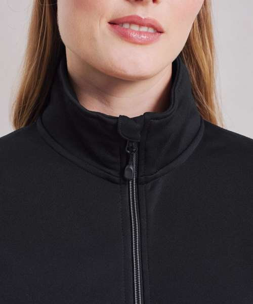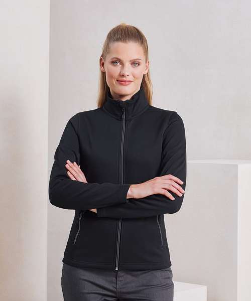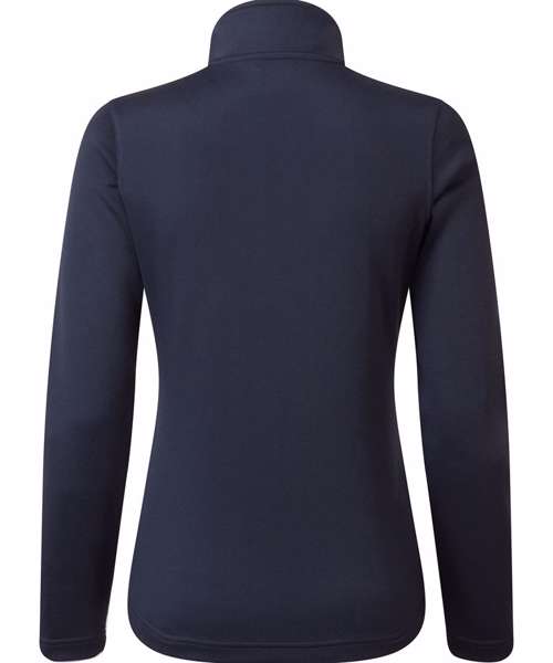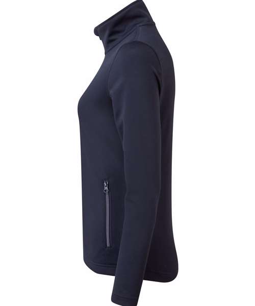 Women's zip-through sweat made with spun dyed certified recycled polyester yarns, a fabric with less impact for a corporate-casual solution. Styled with a fashionable cadet collar and a contrast coloured zip with zip pull. Two external side pockets bear the same zip styling, for a uniform look. Finished with top stitching for a pleasing design feature.