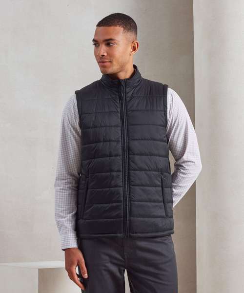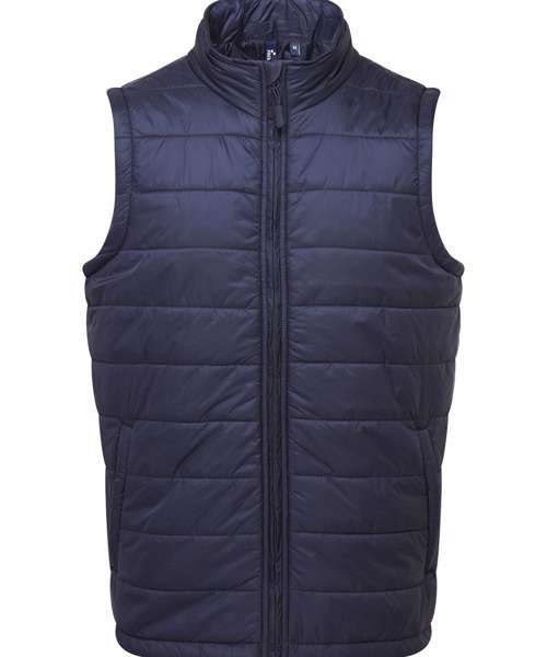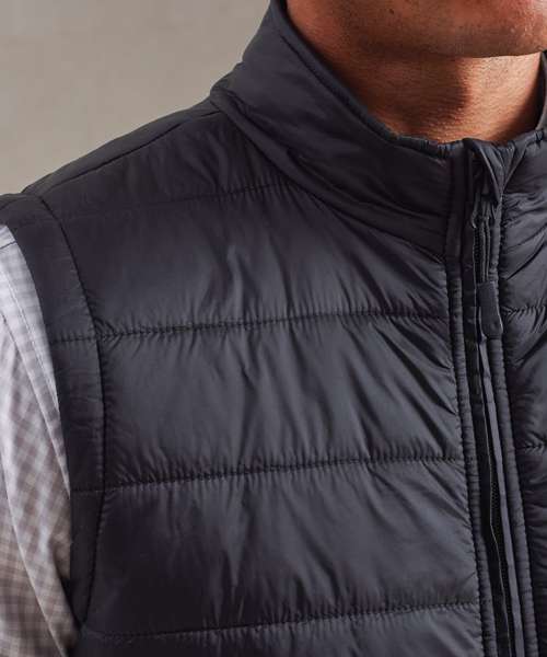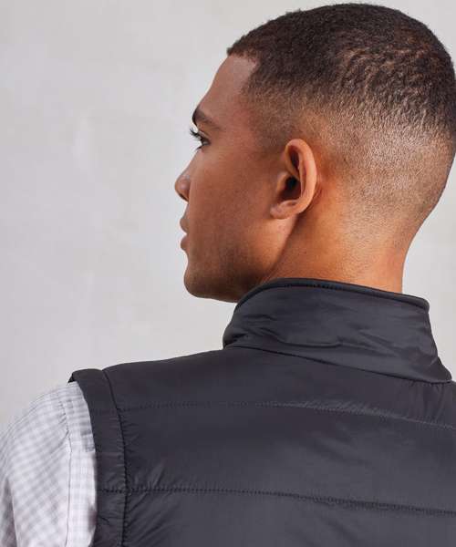 Men’s padded zip-through gilet with horizontal stitching to form baffles, ensuring an even distribution of insulation. Covered zip with chin guard and zip guard to the inner. Styled with a cadet collar. Two welt jet zipped side pockets with a single open pocket to the inner for handy storage. Full embroidery access to the entire bodywarmer through an internal zip in the lining. Lightweight and folds downs easily into its own stuff sack. Made with 100% certified recycled fabrics.