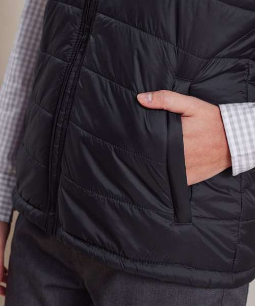 Women’s padded zip-through gilet with horizontal stitching to form baffles, ensuring an even distribution of insulation. Covered zip with chin guard and zip guard to the inner. Styled with a cadet collar. Two welt jet zipped side pockets with a single open pocket to the inner for handy storage. Full embroidery access to the entire bodywarmer through an internal zip in the lining. Lightweight and folds downs easily into its own stuff sack. Made with 100% certified recycled fabrics.