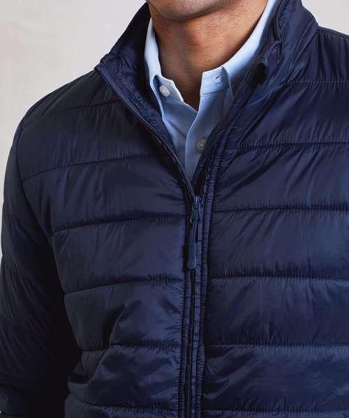 Men’s padded zip-through jacket with horizontal stitching to form baffles, ensuring an even distribution of insulation. Covered zip with chin guard and zip guard to the inner. Styled with a cadet collar. Two welt jet zipped side pockets with a single open pocket to the inner for handy storage. Elasticated cuffs measuring one inch wide. Full embroidery access to the entire jacket through an internal zip in the lining. Lightweight and folds downs easily into its own stuff sack. Made with 100% certified recycled fabrics.