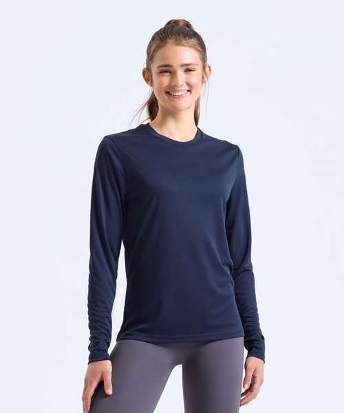 Wicking fabric. Stretch. Crew neck. Long sleeve. Lightweight. Twin-needle stitching on hem and arms. Mesh back. We recommend using block out vinyl and inks.Product contains no branded neck or waist label. Removable Kimble or looped garment tags. Inner seam label holds important product information on one label with a second label containing brand information which can be cut-away. UPF 40+.