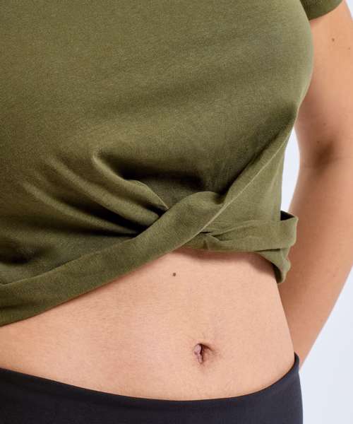 Cropped t-shirt. Short sleeve. Twist detail to front. Crew neck. The product contains no branded neck or waist label. Removable kimble or looped garment tags. The inner seam label holds important product information on one label with a second label containing brand information which can be cut-away.