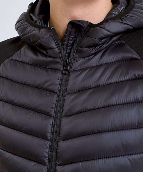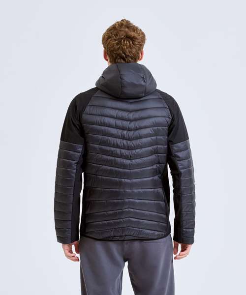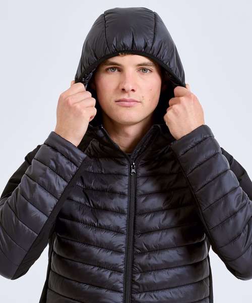 Hybrid jacket with diagonal quilted upper chest and full back. Lower jacket is shell fabric. Full zip-through style with panelled hood. Hood is elasticated for a snug fit. Front pockets. Elasticated hem. Quilted detailing to arms with lower arm in shell fabric. Internal storm flap with zip guard. We recommend using block out vinyl and inks.Product contains no branded neck or waist label. Removable Kimble or looped garment tags. Inner seam label holds important product information on one label with a second label containing brand information which can be cut-away.