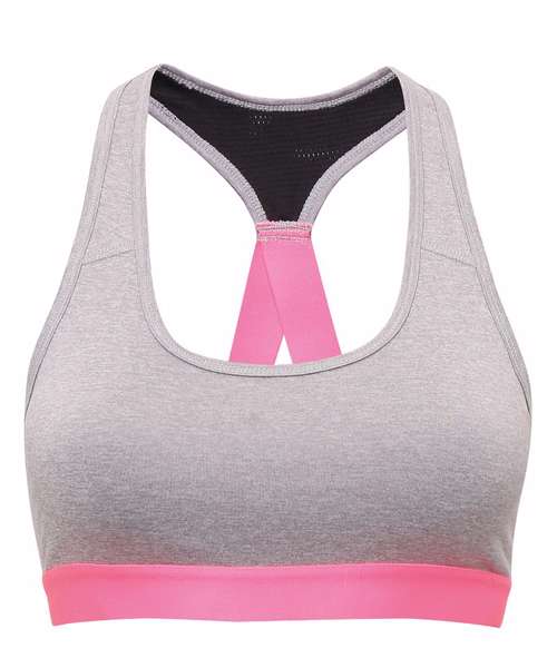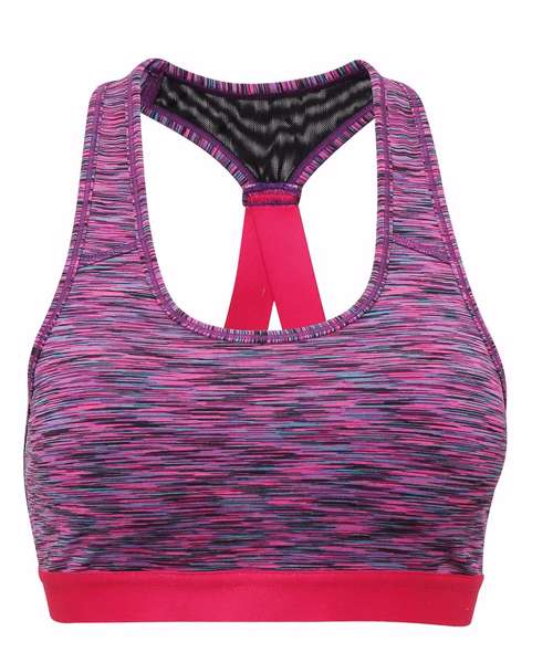 Medium impact sports bra. Elasticated under bust for added support. Removable padding inner. Mesh and elastic back detailing. We recommend using block out vinyl and inks.Product contains no branded neck or waist label. Removable Kimble or looped garment tags. Inner seam label holds important product information on one label with a second label containing brand information which can be cut-away.