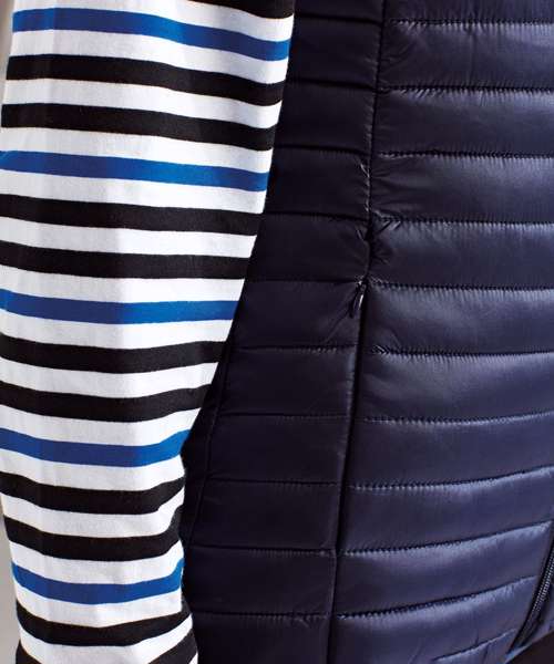 Tonal coil zip on centre front with signature zip puller and internal storm flap and chin guard. Horizontal stitched sandwiched narrow baffles. 250gsm lightweight polyester fill. Internal binding on all seams. Internal back neck hanger loop. Concealed zipped pockets with teardrop pullers. Stretch binding around armholes and hem for added protection. Packable bag. Product contains no branded neck label.* Removable Kimble or looped garment tags. Inner seam label holds important product information on one label with a second label containing brand information which can be cut-away.